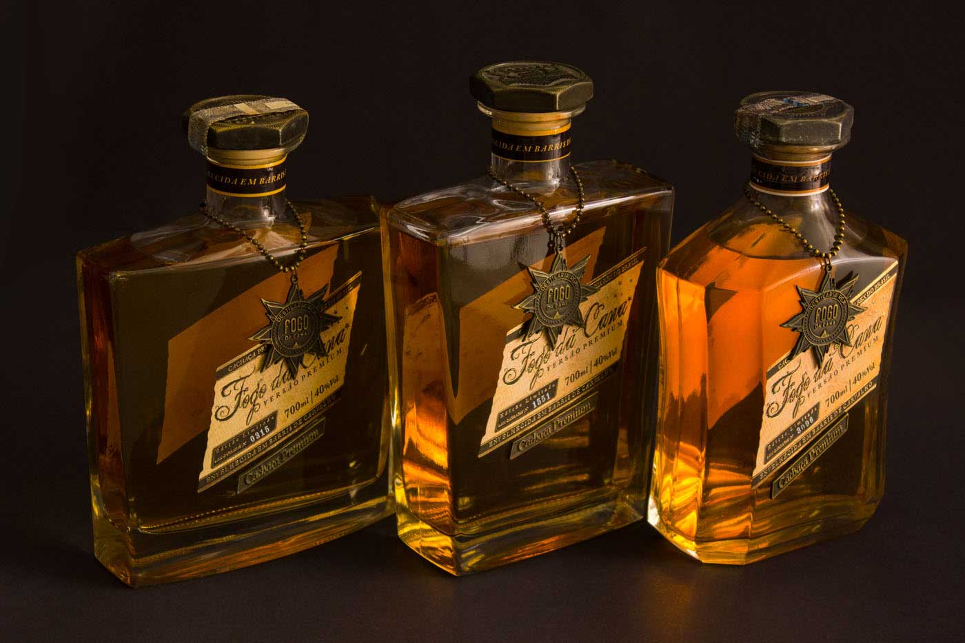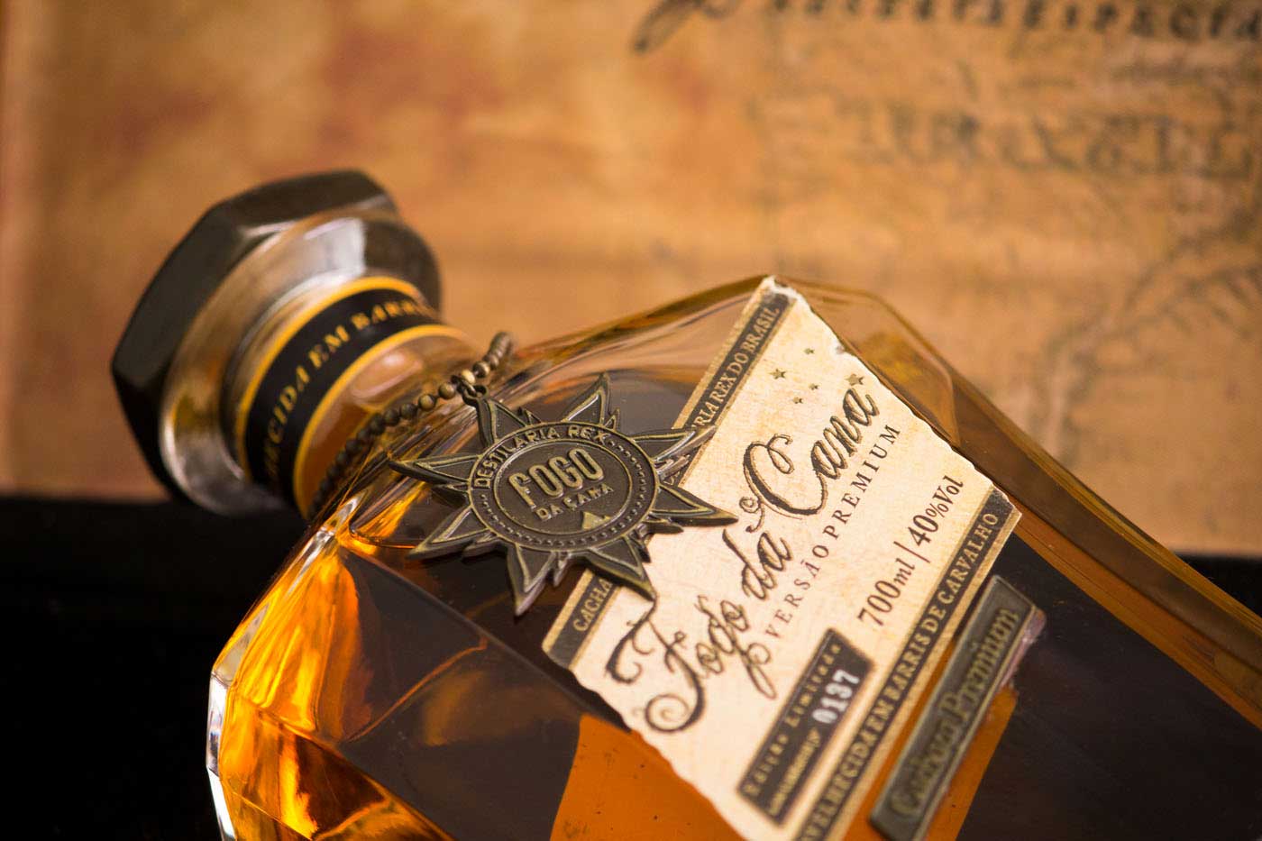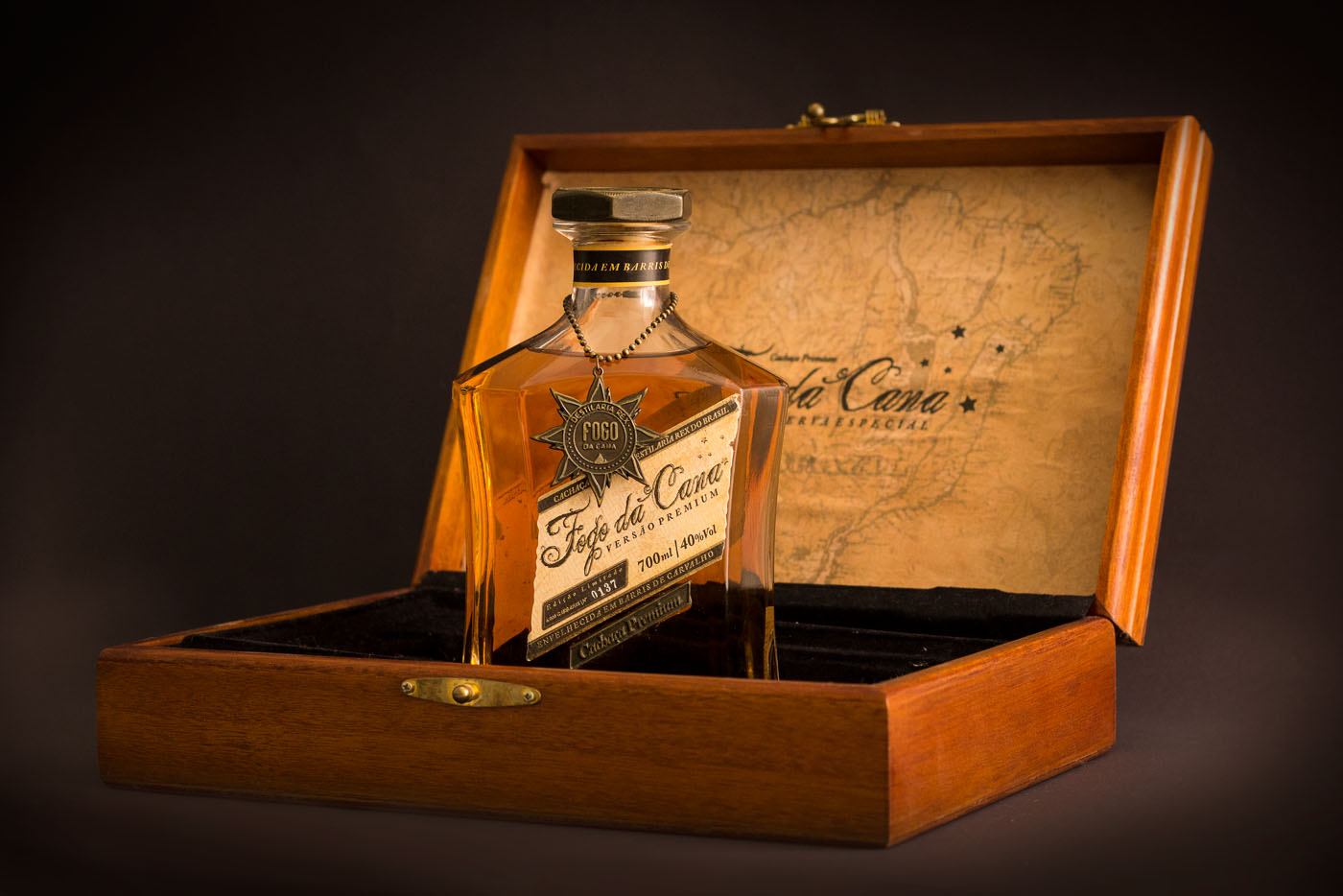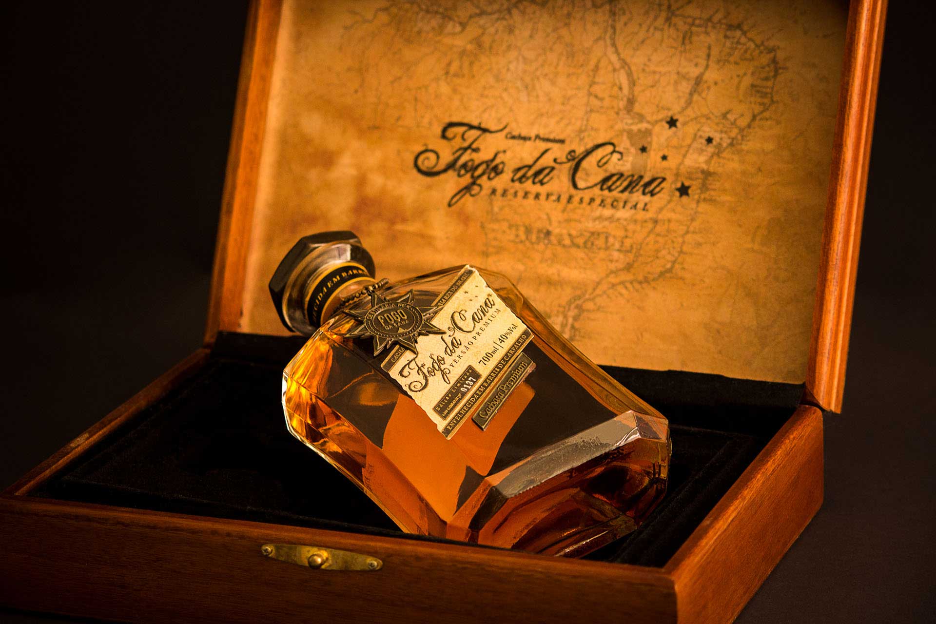 品牌的標志是經過精心設計的充滿復古感的字體,為了突出巴西高檔酒的尊貴,我們為它的包裝設計了獨特的瓶形和木箱。此外,這款高檔酒數量有限,是限量版,所以每個產品標簽上都有編號,并已完成燙金工藝,個性化地定制金屬蓋、精心制作的金屬標志垂飾以及酒本身火焰般的色彩都使包裝更加奢華和復古,豐富了產品的展示。