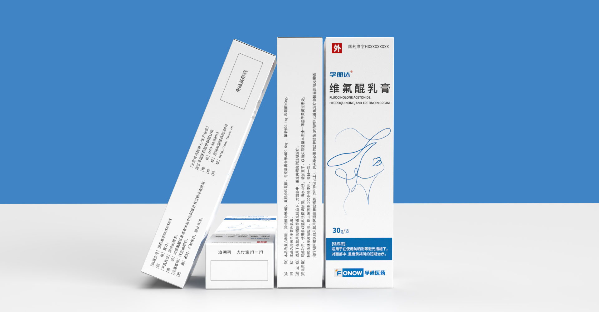 孚諾醫藥兩批次委托石特大健康進行產品包裝設計,首次設計產品上市滿意后進行了二次新款的設計;為維氟醌乳膏設計包裝:“孚康達”的首字母“F”進行創意設計,紫色、白色色塊勾勒“F”字形,增強品牌識別,紫色寓意優雅、高貴,以其為主色與產品主要治療功效變美的預期目標相符合。同款產品兩個渠道不同設計方案。