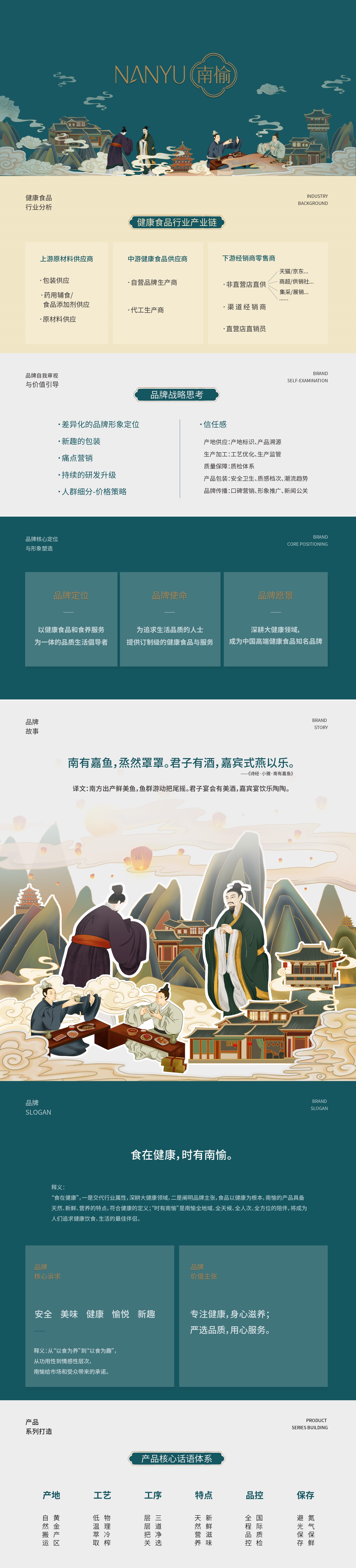 品牌是利潤工具,產(chǎn)品是第一品牌力。基于此,石特對南愉的市場力、品牌力、產(chǎn)品力等情況進行全方面的分析與洞察,結(jié)合南愉品牌獨有的特點,精心為南愉的品牌市場化道路提出合理化建議。石特將南愉定位為“以健康食品和食養(yǎng)服務(wù)為一體的品質(zhì)生活倡導(dǎo)者”的品牌,將“食在健康,時有南愉。”作為南愉品牌的SLOGAN,利用簡短有力的文字傳達南愉品牌調(diào)性。在logo設(shè)計上,將品牌名和“中國結(jié)、中式鏤空花窗及樹葉”這些極具代表中國的古典元素巧妙結(jié)合,利用中式古典的風(fēng)格進行視覺呈現(xiàn)。在包裝設(shè)計上,注入”仁、禮、義、勇、敬”的中國傳統(tǒng)文化,結(jié)合產(chǎn)品特性,尋找到高度的契合點,以原創(chuàng)手繪插畫的創(chuàng)意表現(xiàn)形式,將文字、畫面、故事等融入產(chǎn)品包裝設(shè)計中,充分為南愉賦予豐富的文化內(nèi)涵。無論是從策劃還是到視覺呈現(xiàn)效果上,我們注重突顯出南愉的文化內(nèi)涵與品牌價值,進而提升品牌的附加值。本次石特為南愉品牌全案的成功策劃,得到了客戶的高度認可。