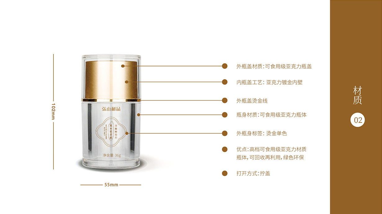 首先內盒采用透明食用級亞克力瓶身,對品牌獨有標牌和弘山利品品牌標簽進行設計,黑米+花的形狀,結合黑米的黑,體現(xiàn)“米中黑珍珠”的營養(yǎng)價值;再用金色,其一含義是黑米稻穗的顏色,體現(xiàn)天然無添加的自然感受;其二含義是黑米花青素是色素之精品,體現(xiàn)其高貴地位。通過包裝升級統(tǒng)一形象后,深化了弘山禮品在用戶心中的外在形象,品類包裝問題得以解決。