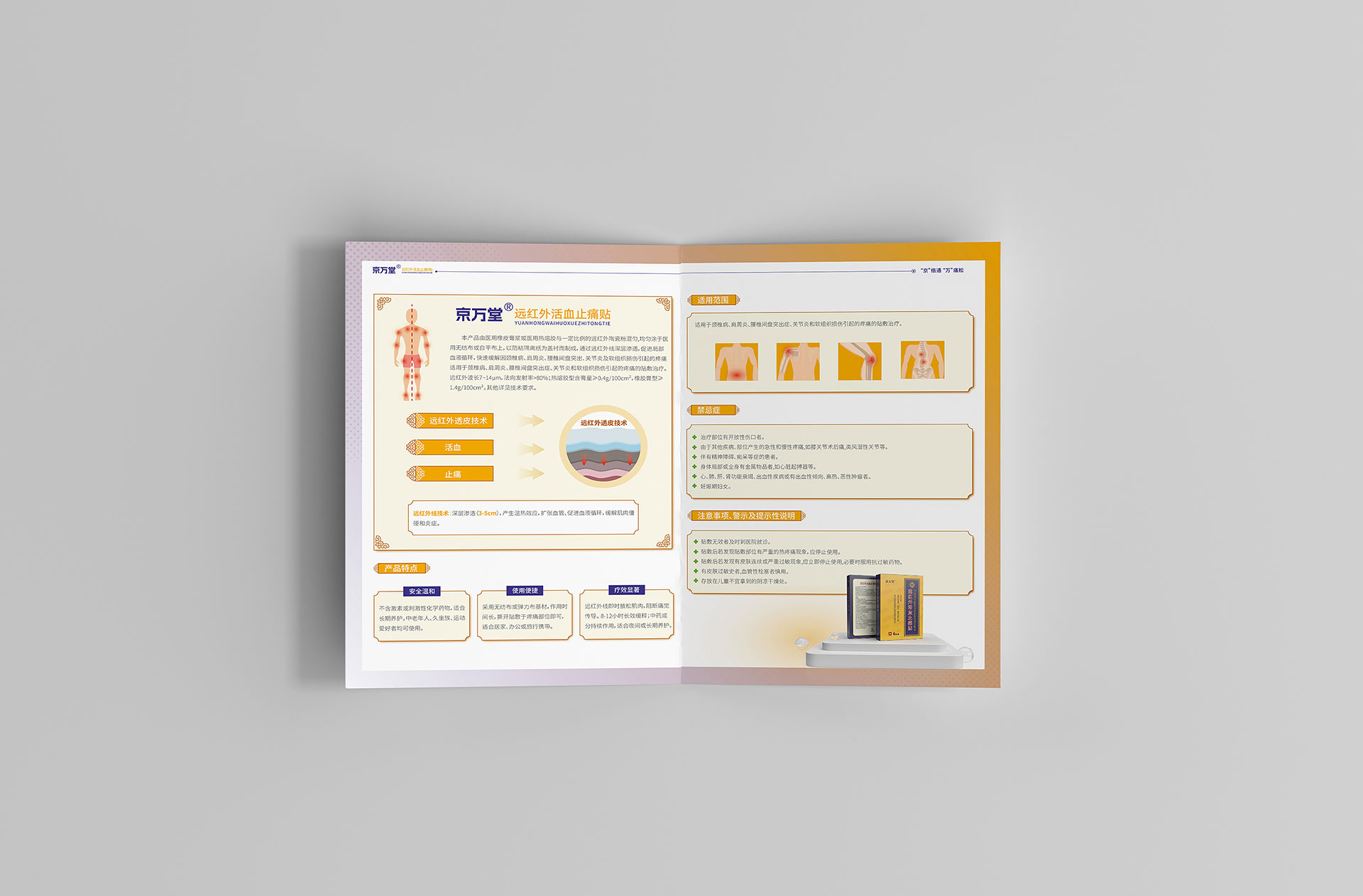 本項目是石特大健康為廣州康安醫藥有限公司旗下的4款遠紅外磁貼產品所進行的DA(Detail Aid)折頁排版設計。面對產品功能相似但定位各有側重的系列產品,客戶需要一套能夠清晰區分產品特性、并高效傳達“活血化瘀、消腫止痛”等核心功效的專業宣傳工具。我們的挑戰在于,如何在有限的單頁或折頁空間內,通過系統化的視覺設計,將產品原理、適用癥、產品優勢及臨床證據等信息進行科學排布,使之成為醫藥代表手中強有力的溝通利器,助力其在短暫的拜訪時間內精準影響醫生處方決策。